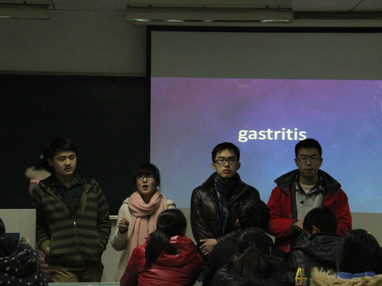 20141213日晚,“我是词人”比赛在我校西一415教室火热开战。本次比赛由医学进展研究会举办,旨在通过趣味竞赛的方式加强同学们对医学专业词汇的记忆。到场参赛的共有6组选手,大家个个踌躇满志。