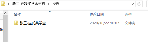 备注:校设和院设奖学金分开汇总(即两个文件夹,文件夹里每个学生的材料单独整理成一个文件夹,命名为:姓名-专项奖学金名称(如张三-庄氏奖学金)。