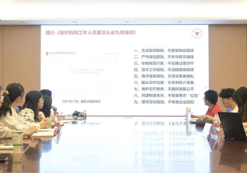 除《条例》之外,顾国煜还贴近支部党员同志的专业特色以及未来从业方向,带领大家学习了《医疗机构工作人员廉洁从业九项准则》,引领大家树立良好的医德医风。